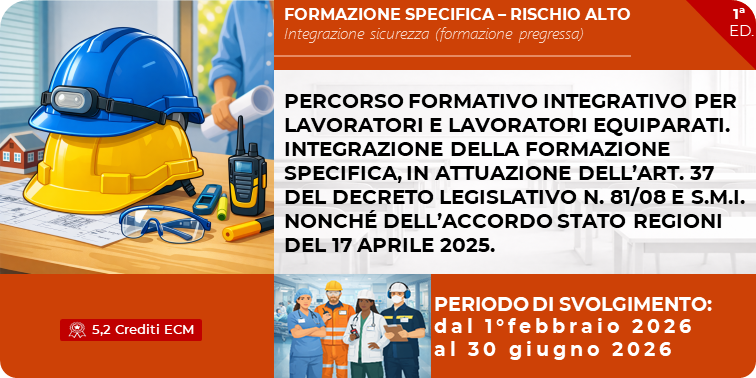 2026 – PERCORSO FORMATIVO INTEGRATIVO PER LAVORATORI E LAVORATORI EQUIPARATI. INTEGRAZIONE DELLA FORMAZIONE SPECIFICA, IN ATTUAZIONE DELL’ART. 37 DEL DECRETO LEGISLATIVO N. 81/08 E S.M.I. NONCHÉ DELL’ACCORDO STATO REGIONI DEL 17 APRILE 2025.