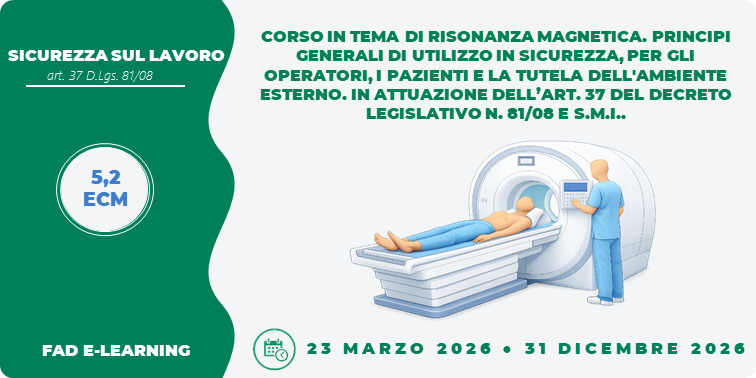 2026 – CORSO IN TEMA DI RISONANZA MAGNETICA. PRINCIPI GENERALI DI UTILIZZO IN SICUREZZA, PER GLI OPERATORI, I PAZIENTI E LA TUTELA DELL'AMBIENTE ESTERNO. IN ATTUAZIONE DELL’ART. 37 DEL DECRETO LEGISLATIVO N. 81/08 E S.M.I..